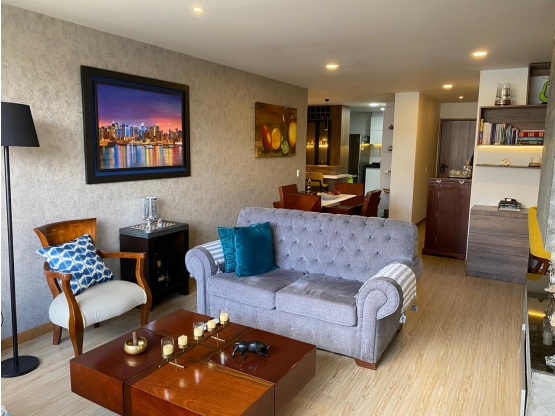 Apartamento en venta remodelado, exterior, luz natural, sol de la tarde, sala comedor con chimenea funcional, estudio, bar y barra de comidas, cocina integral, área de lavandería, baño social, hall de habitaciones, amplia habitación auxiliar con baño contiguo, amplia habitación principal con baño y walk in closet, ventanas anti ruido, parqueadero doble y depósito. Estrato 6, seguridad 24/7.